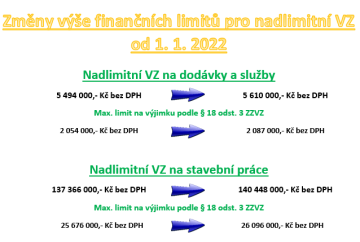 - Nadlimitní VZ na dodávky a služby: 5 610 000,- Kč bez DPH – veřejné zakázky na dodávky a služby (původně 5 494 000,- Kč bez DPH),